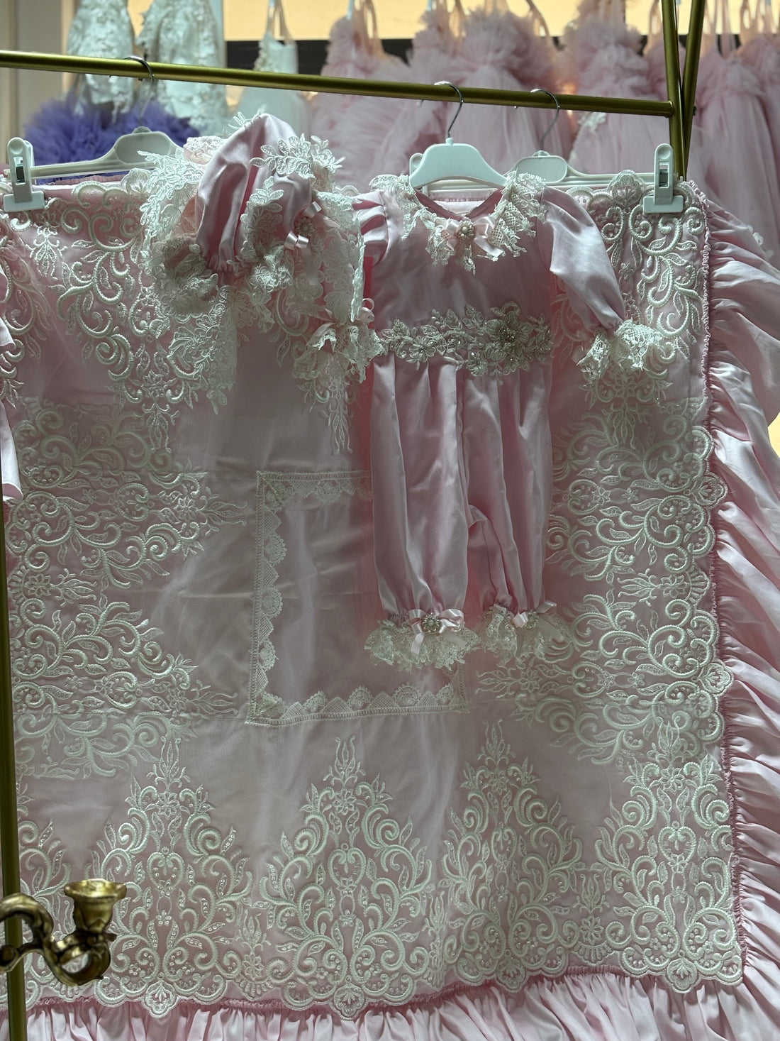 This exquisite baby set is crafted from luxurious pink silk fabric with delicate lace details,...