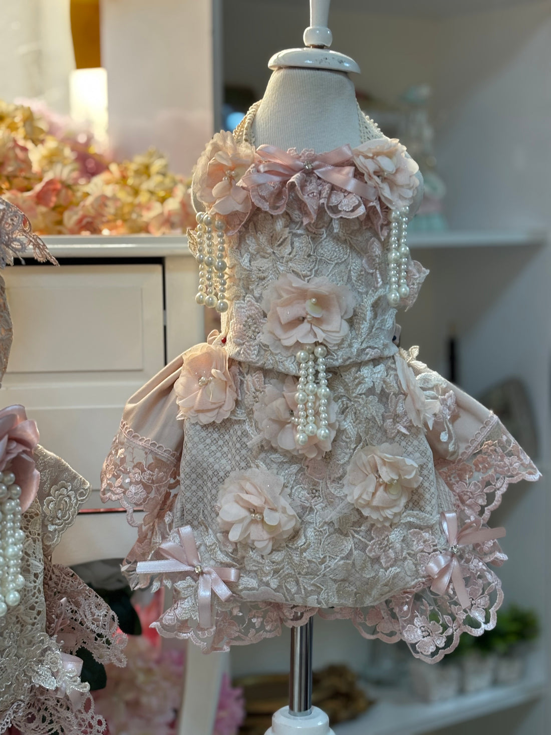 cream silk fabric pearl details two pieces outfit and bonnet girl and baby