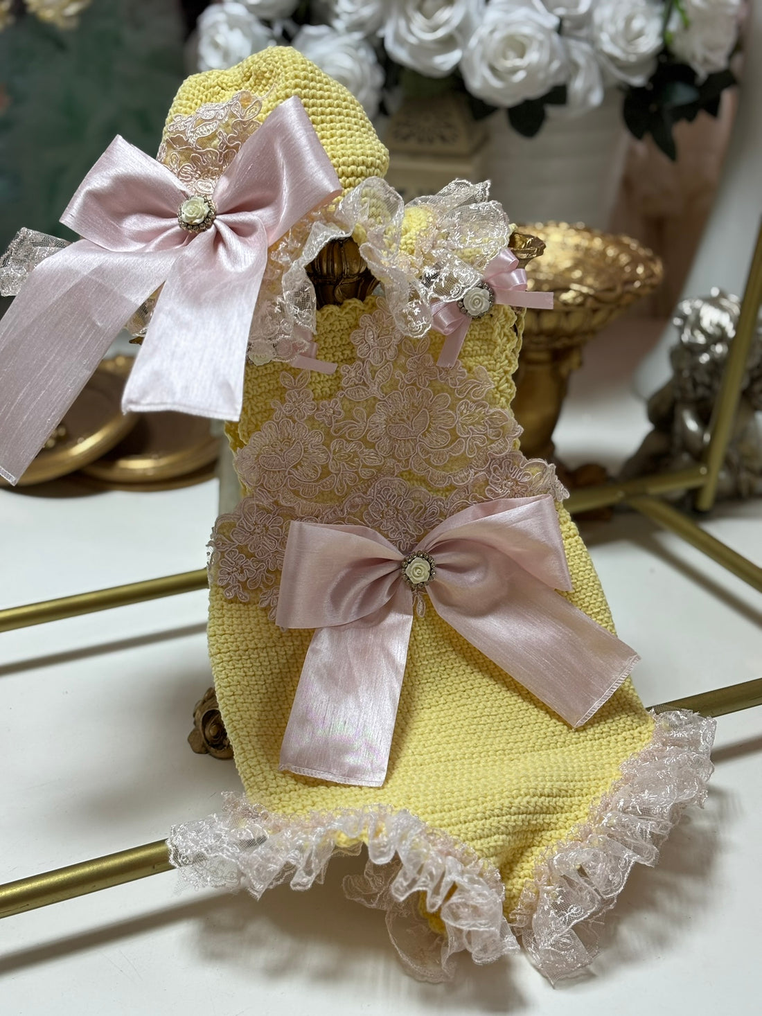 yellow knitwear romper and bonnet lace aplique