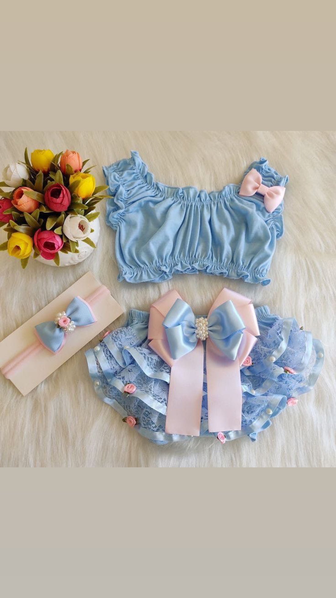 Light Blue Two Pieces And Hairband Baby Girl Outfit