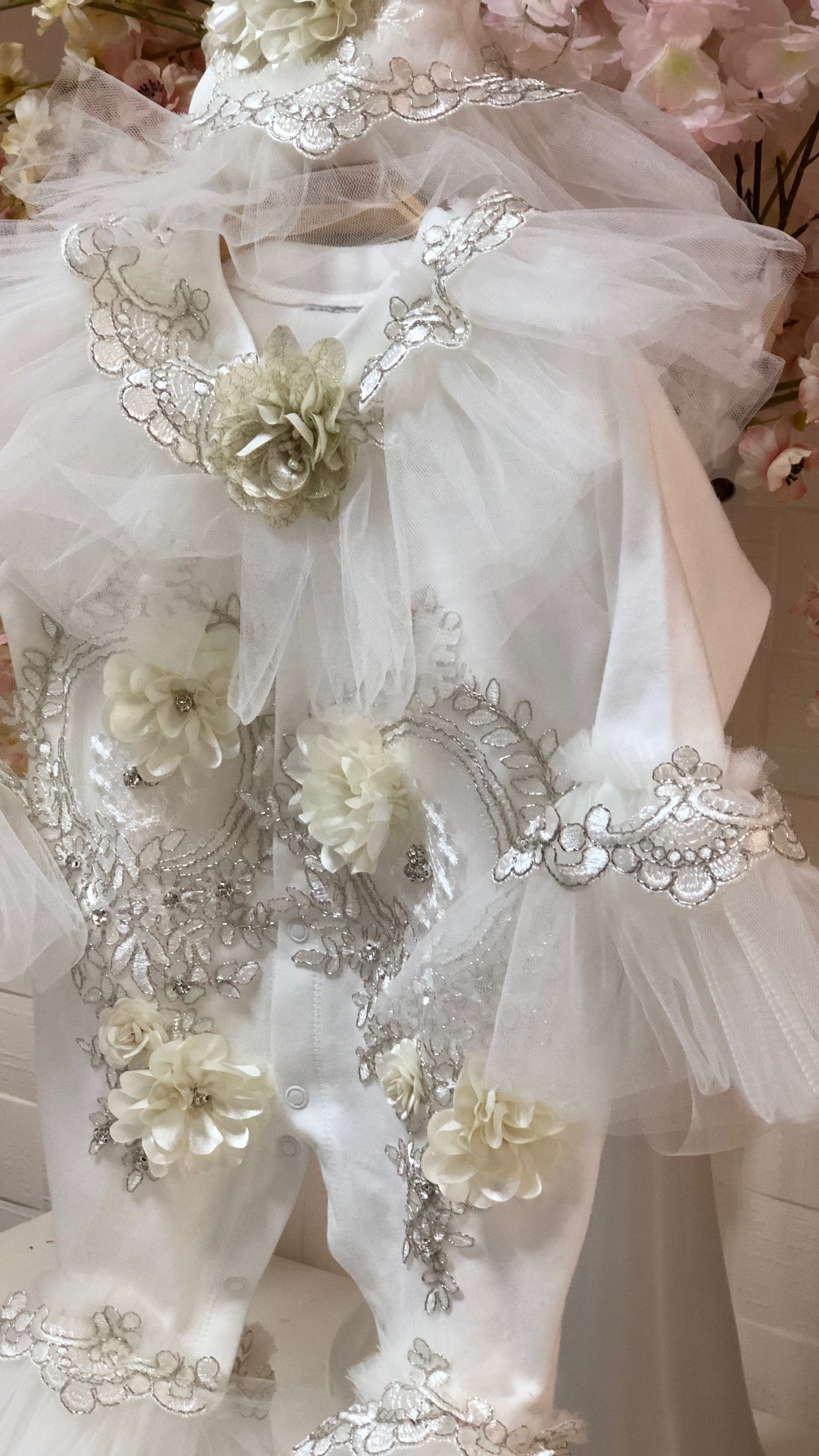 Welcome your little one's special day with this elegant cream cotton baptism set. Crafted from soft, breathable cotton, this three-piece ensemble includes a beautifully tailored jumpsuit, coordinating hat, and delicate blanket—perfect for christenings and formal celebrations. The gentle cream tone complements all skin tones and photographs beautifully. Each piece is designed with comfort in mind, allowing your baby to move freely while maintaining a polished, sophisticated appearance. Ideal for creating lasting memories during this meaningful milestone.